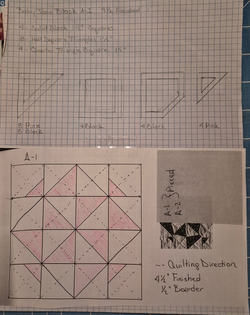 Graph paper has been my best friend—drawing layout, cutting notes, and quilting direction gave me at least a starting point. Maybe I won’t need this level of detail for every block, but for this first set, it provided the confidence boost I needed.