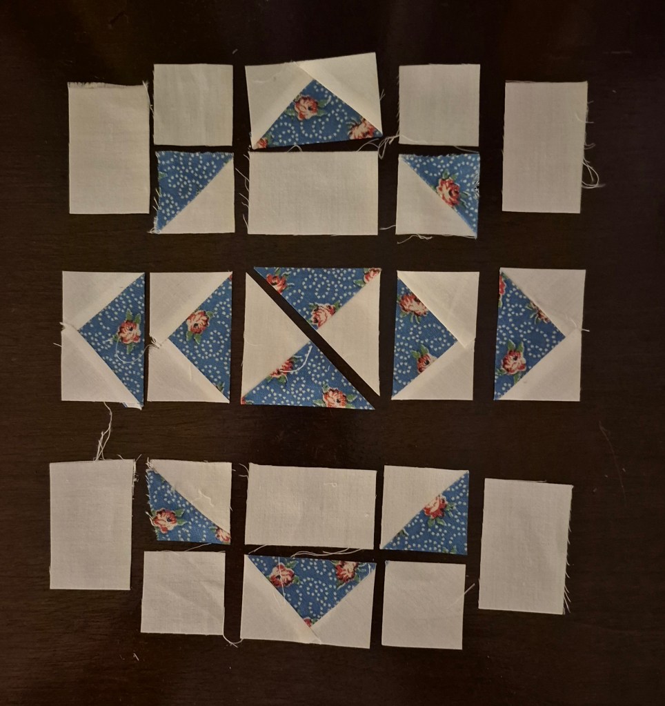 This block is mostly half‑square triangles—and this is where grainline absolutely matters. Cutting them on the bias introduces stretch that can warp the block. Keeping pieces on‑grain wherever possible helps maintain accuracy as you stitch.